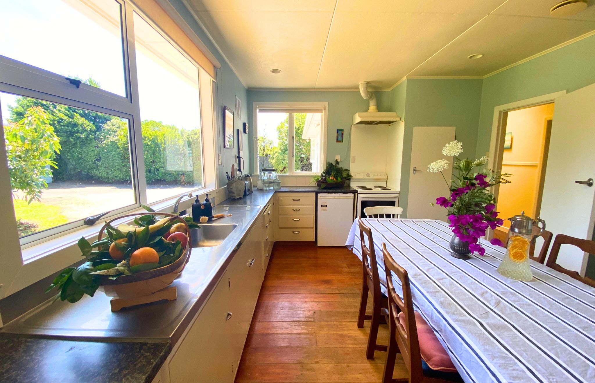 Plenty of parking and storage, with a turn-around area and large high-stud double garage/workshop, plus room for a boat or caravan. Bore water, mains sewer, and Healthy Homes compliant. Close to schools and town amenities, yet very low traffic noise, in a friendly, peaceful neighbourhood.